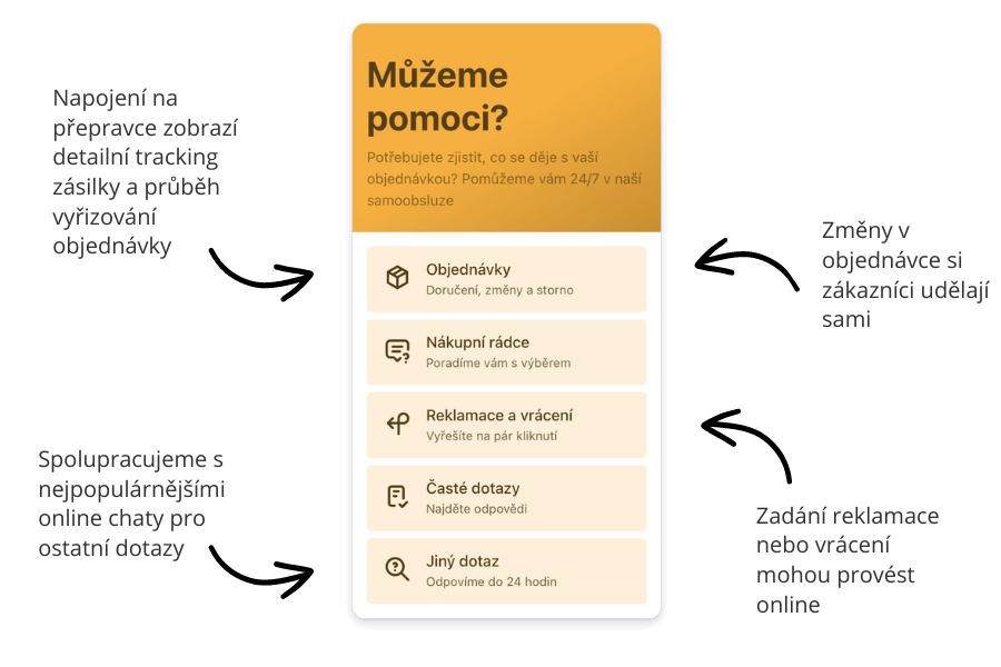 Webový widget, který máte vložený na webu podobně jako chatovací okno. Rozdíl je vidět na první pohled: Namísto chatu je zde připravené přehledné menu, ve kterém si návštěvníci mohou vybrat, co potřebují řešit.